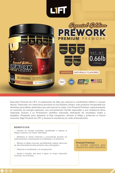Descubre Prework de L1FT, el suplemento de élite que elevará tu rendimiento atlético a nuevas alturas. Fabricado con meticulosa precisión en los Estados Unidos, este producto insuperable fue diseñado para atletas dedicados que solo buscan lo mejor. Con Prework Premium, experimentarás un aumento de energía explosiva, una concentración mental impecable y una resistencia física mejorada. Gracias a su formulación científica avanzada, disfrutarás de resultados reales y tangibles. Prepárate para optimizar el flujo sanguíneo, retrasar la fatiga y potenciar tu fuerza muscular. Elige Prework de L1FT y alcanza la excelencia en cada entrenamiento.
